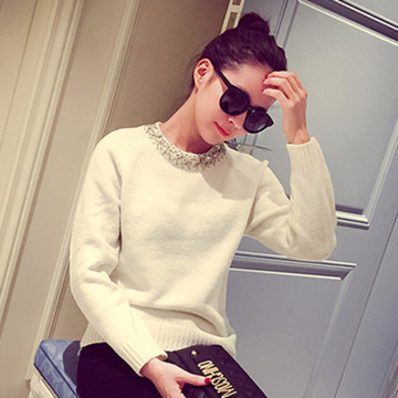 時(shí)尚秋季淑女潮流套頭衫圓領(lǐng)長(zhǎng)袖修身百搭純色釘珠打底針織衫 /