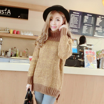 韓版女式百搭潮流針織衫高領(lǐng)長(zhǎng)袖純色直筒中長(zhǎng)款開(kāi)叉下擺前短后長(zhǎng) /