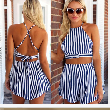 婧琪女裝現(xiàn)貨亞馬遜爆款歐美藍(lán)白條紋吊帶背心加短褲性感兩件套 /