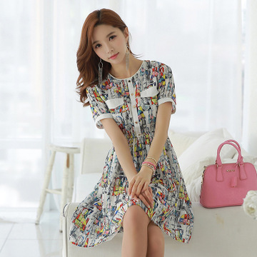2016夏季潮流新品歐美大牌高端女裝短袖仿真絲印花裙連衣裙 /