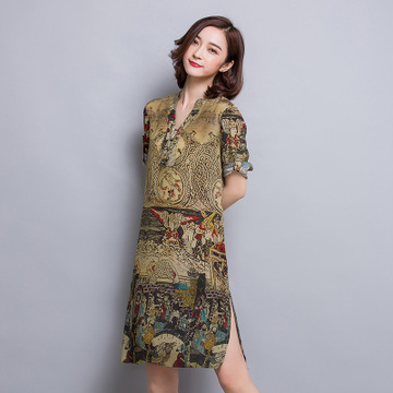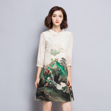 2016夏季中國風(fēng)復(fù)古真絲連衣裙修身女裝中長款七分袖桑蠶絲裙子 /
