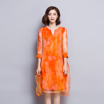 2016夏裝新品歐根紗連衣裙女中長款大碼高端桑蠶印花真絲裙代發(fā) /