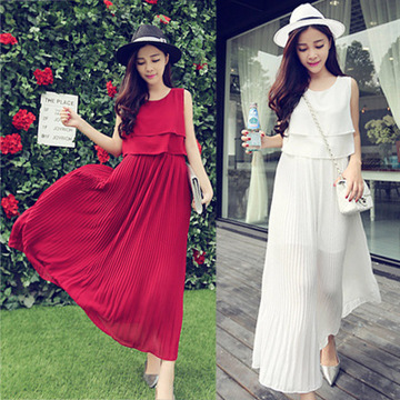 2016夏季連衣裙女神飄逸百褶荷葉邊雪紡波西米亞連衣長裙 /