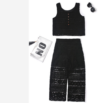 實(shí)拍5226#歐洲站2016夏裝新款兩件套背心闊腿褲套裝水溶蕾絲女 /