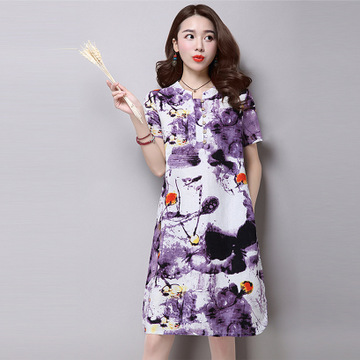 2016夏季新款民族風(fēng)棉麻大碼女裝寬松顯瘦亞麻花色短袖連衣裙 /