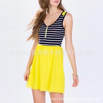 速賣(mài)通亞馬遜爆款2016夏季新款歐美外貿(mào)拼接條紋連衣裙 /