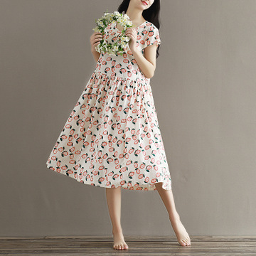 外貿2016夏裝新款森林系文藝復古小蜜桃印花棉麻寬松短袖連衣裙女 /