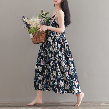 小清新2016夏季新品大碼女裝文藝棉麻大擺裙寬松吊帶裙印花連衣裙 /