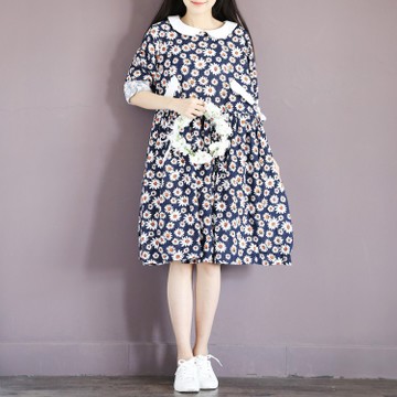 文藝雛菊印花長袖娃娃領棉麻連衣裙日系森女系寬松大碼中長款春夏 /