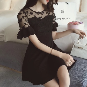 2016夏裝新款韓版修身 百搭肩部網(wǎng)紗荷葉邊連衣裙短裙女 /