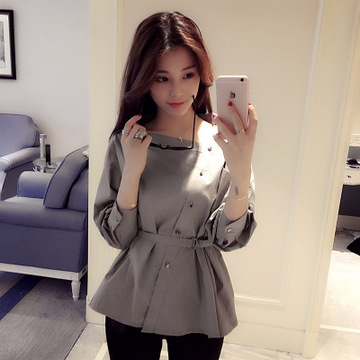 歐美2016春裝新款韓版百搭打底襯衫一字領(lǐng)收腰長(zhǎng)袖上衣女 /