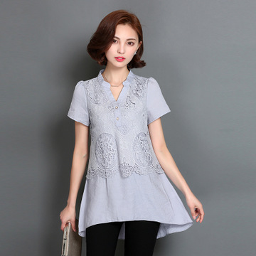 實(shí)拍2016新款中長(zhǎng)款拼接蕾絲棉麻女短袖大碼女裝韓版亞麻T(mén)恤上衣 /