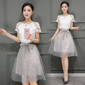 2016夏季女裝名媛蕾絲套裝連衣裙印花小清新顯瘦歐根紗兩件套女 /