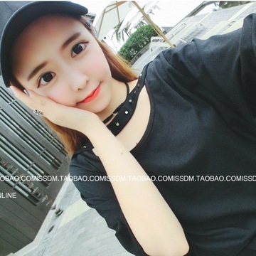 韓國女裝 原宿風(fēng) 鏤空鉚釘掛脖寬松大碼五分袖潮款打底T恤 /