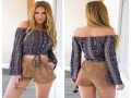 漢帛蘭女裝一字肩系帶束腰喇叭袖長(zhǎng)袖印花上衣 /