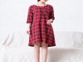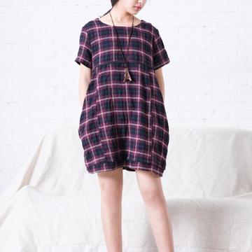 森繪棉麻女裝春夏新甜美日系百褶邊圓領(lǐng)大格子連衣裙寬松顯瘦麻裙 /