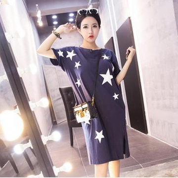 2016夏季新款韓版系帶露背短袖星星圖案開叉大碼連衣裙 /