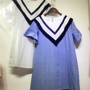 新款學(xué)院風(fēng)前后雙V領(lǐng)喇叭袖豎條紋 /