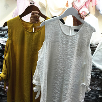 新款甜美露肩袖口蝴蝶結(jié)綁帶棉麻上衣 4色 /