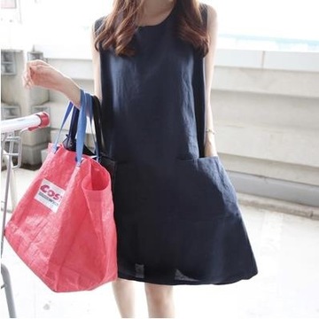 夏裝韓版寬松大碼棉麻連衣裙純色中長(zhǎng)款無袖背心裙亞麻A字裙 /