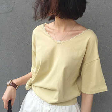 原宿bf風純色V領(lǐng)蕾絲拼接寬松短袖T恤女夏季基礎(chǔ)百搭純棉上衣韓版 /