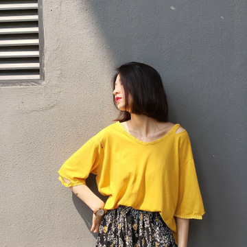 蕾絲破洞原宿bf風純棉V領(lǐng)短袖T恤女中長款夏季寬松大碼女裝上衣 /