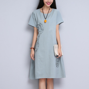 大碼女裝 2016夏季新款復古文藝棉麻民族風立體花寬松短袖連衣裙 /