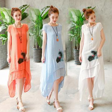 2016夏新棉麻連衣裙中長款大碼文藝印花寬松顯瘦雙層不規(guī)則裙 /