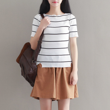 新款修身百搭針織短袖T恤女裝條紋打底衫一字領(lǐng)上衣文藝 /