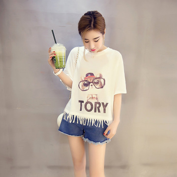小穎家 保證質(zhì)量韓版寬松顯瘦圓領(lǐng)流蘇百搭印花短袖T恤衫 女 /