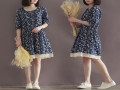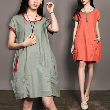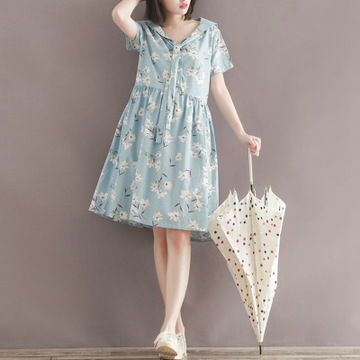 一件代發(fā)夏季大碼女裝文藝小清新海軍風棉麻印花短袖寬松連衣裙潮 /