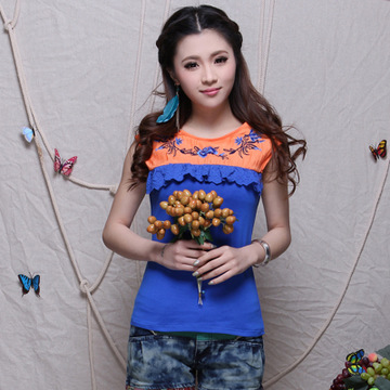 特價款 民族風(fēng)新款女裝全棉圓領(lǐng)修身花邊拼繡花短袖T恤打底衫 /