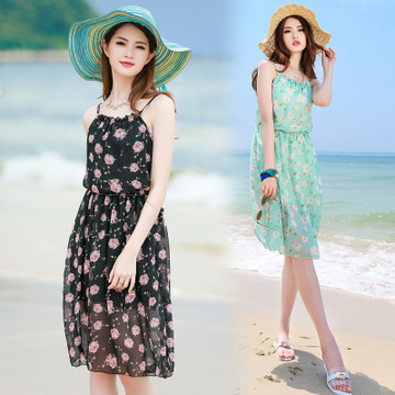 實拍甜美海邊度假波西米亞長裙碎花吊帶沙灘裙連衣裙 多色 /