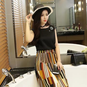 實拍2016夏裝新款韓版圓領(lǐng)無袖背心+高腰彩色印花中長裙套裝 /