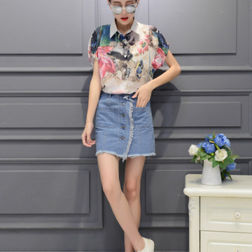 水墨花蓮花襯衫女上衣+牛仔半身裙短裙時(shí)尚休閑套裝 /