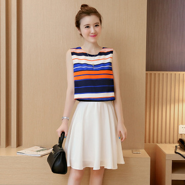 誠(chéng)招代理 2016夏季韓版新款圓領(lǐng)條紋印花連衣裙時(shí)尚兩件套連衣裙 /