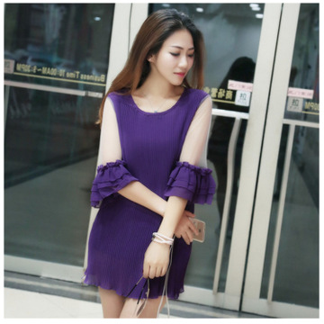 2016新款網(wǎng)紗拼接喇叭袖雪紡百褶短裙女裝連衣裙裙子 /