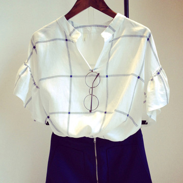 2016夏季新款女裝 韓范喇叭袖格子 寬松顯瘦棉布短袖襯衫 /