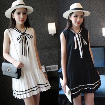 2016夏季新款 V領(lǐng)蝴蝶結(jié)系帶 百褶拼接雪紡無(wú)袖連衣裙女 /