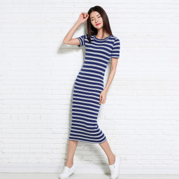 2016夏季新款韓版短袖針織裙連衣裙女長(zhǎng)款海軍風(fēng)顯瘦條紋長(zhǎng)裙子 /