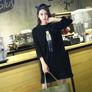 韓版春秋裝寬松大碼長款卡通個性小人休閑圓領(lǐng)衛(wèi)衣裙女純棉 /