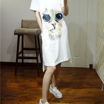 夏季新款休閑韓版寬松顯瘦中長款短袖T恤裙貓頭連衣裙打底裙 /