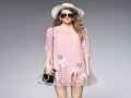 2016歐美夏季新款歐根紗花朵刺繡花邊拼接蕾絲A字連衣裙送吊帶潮 /