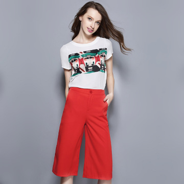 2016夏歐美新品卡通印花拼接短袖T恤+摩登紅色七分闊腿褲兩件套裝 /