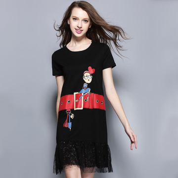 2016夏季新款歐美個性卡通腰帶印花圓領(lǐng)短袖蕾絲拼接荷葉邊連衣裙 /