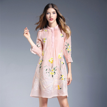 2016夏女裝新款 歐美重工刺繡花朵立領(lǐng)A字型寬松連衣裙配吊帶潮 /