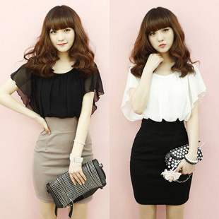 韓國熱銷 蝙蝠袖拼色時(shí)尚皺褶假兩件收腰連衣裙 女裝代理F6055 /