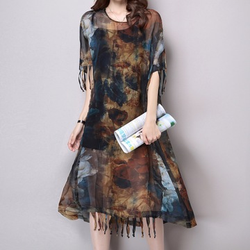 柔順2016夏裝新款 韓版圓領(lǐng)長裙流蘇寬松雪紡連衣裙印花雪紡裙女 /