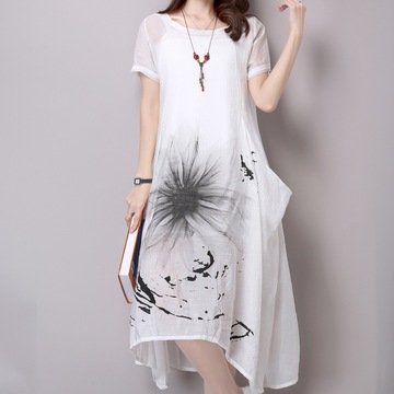 2016夏季新款文藝休閑短袖棉麻連衣裙女夏中長款大碼寬松a字裙 /