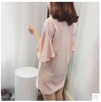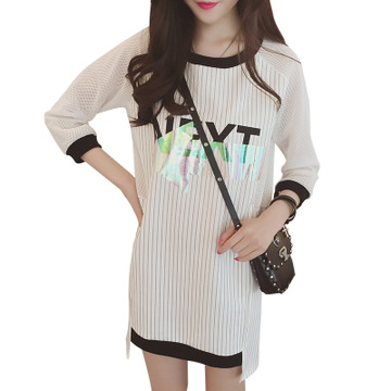 2016新款韓國時尚街拍拼接鏤空長袖字母印花連衣裙夏季豎條 /
